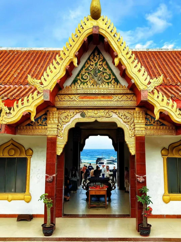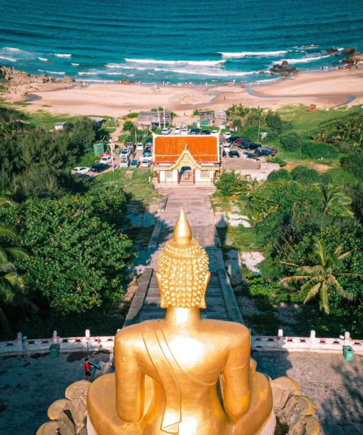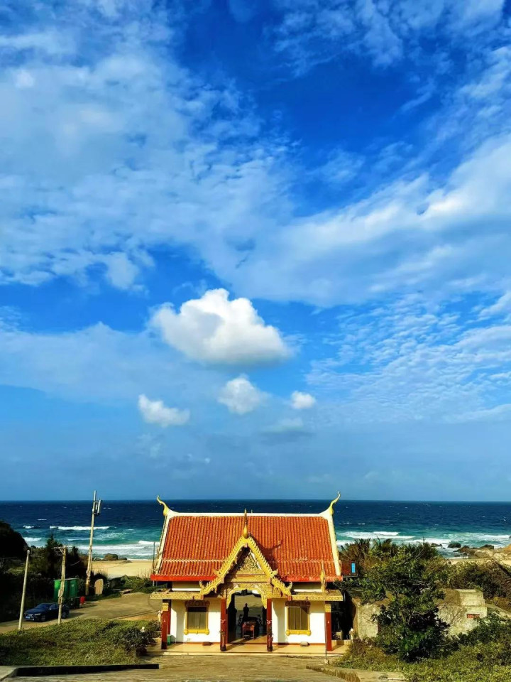 寺庙不大,拾级而上,山下庙宇与远处蔚蓝大海尽收眼底。山顶一尊佛像,日夜守望着大海。远处沙滩沙质虽非上乘,却充满孩童的欢声笑语,夕阳更是美不胜收。