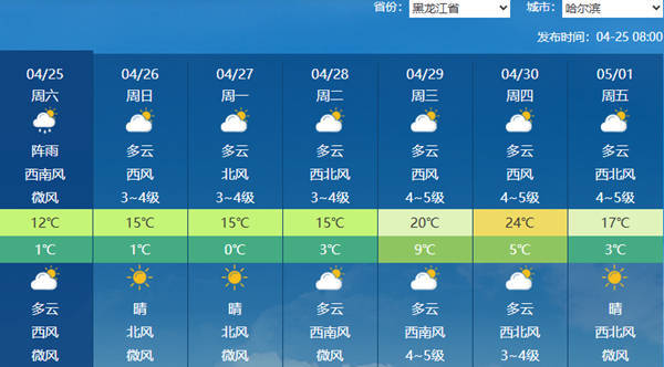 中国天气网讯 未来三天(4月25日至27日),黑龙江仍多雨雪天气,其中今天,黑龙江部分地区有中到大雨,大兴安岭等地或现降雪,同时部分地区气温将显著下降,哈尔滨最高气温将由20℃出头跌至10℃出头,冷意再现。