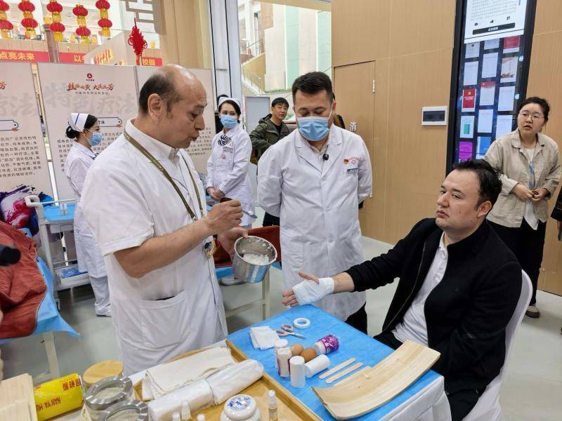 大会的活动交流环节,来自和田地区维吾尔医医院康复科主治医师艾西丁艾比布拉正在向与会人员展示维吾尔医中较具特色的敷贴疗法、乳鸽血疗法、涂油疗法、埋沙疗法。
